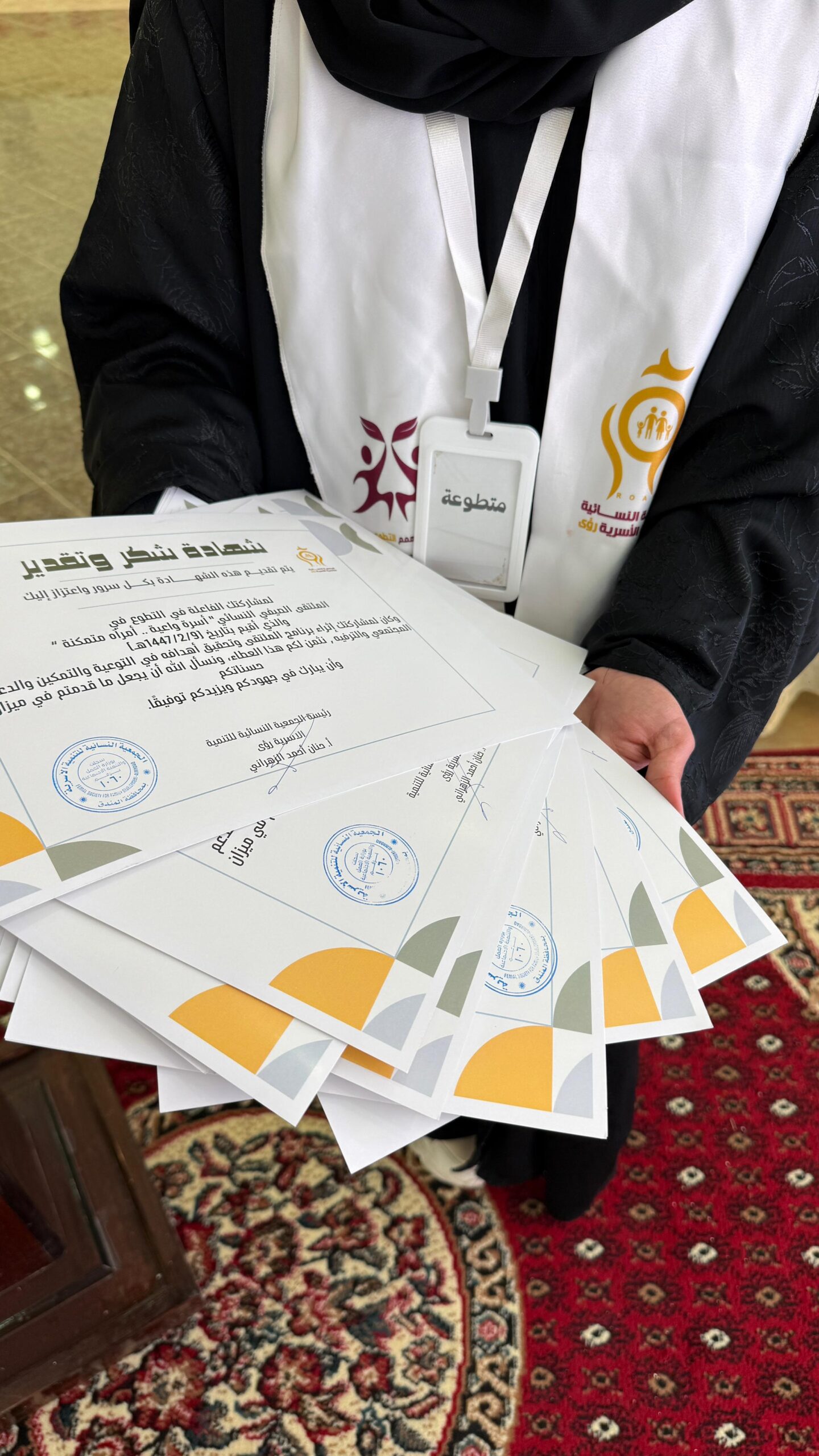 تحت رعاية سعادة محافظ محافظة المندق الاستاذ قاسم بن سعيد ال محسن تم تديشن الملتقى النسائي بعنوان “أسرة واعية، امرأة متمكنة” الذي أقيم يوم الأحد الموافق 9 صفر 1447هـ،وبشراكة مع فرع وزارة الموارد البشرية والتنمية الاجتماعية وكان ذلك بحضور كل من رئيسة الجمعية و موظفات فرع الوزارة , كما حضر الملتقى العديد من مستفيدي الجمعية و الزوار